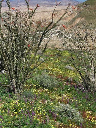 Ocotillo (red), desert dandelion (yellow) and arizona lupine (blue) at Carrizo Badlands overlook.