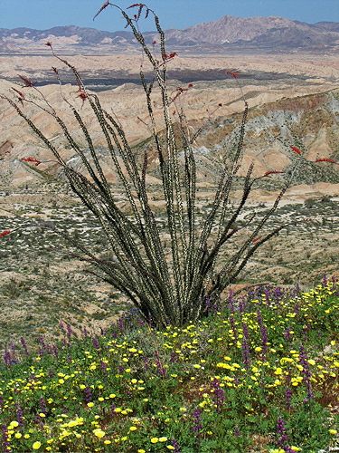 Looking out to the Carrizo Badlands with desert dandelion, arizona lupine, and ocotillo.
