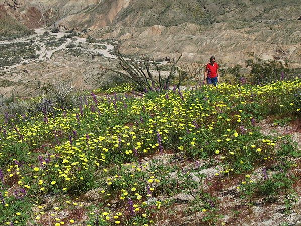 Karen admires the desert dandelion at Carrizo Badlands overlook.
