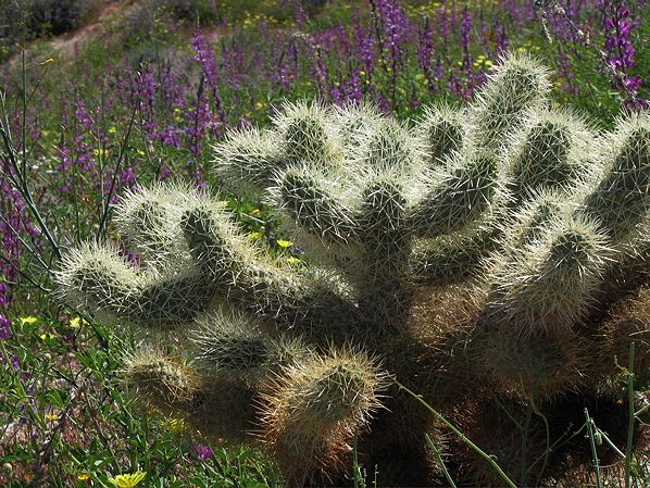 Teddy bear cholla guards a field of arizona lupine at Carrizo Badlands overlook.