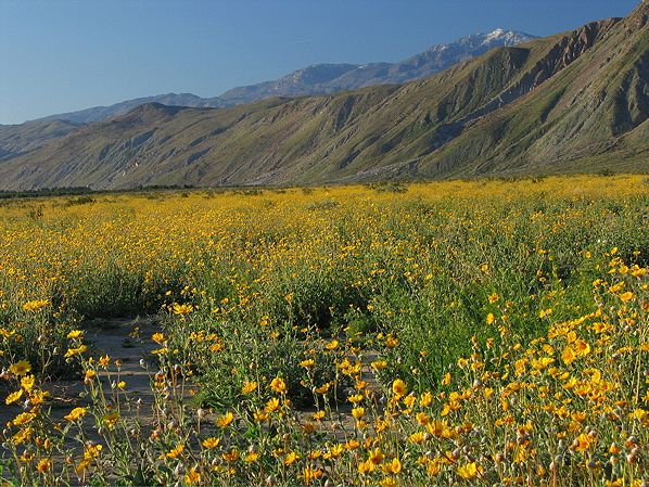 Field of desert sunflower in Borrego Valley (Henderson Canyon Rd), Coyote Mtn and Santa Rosa Mtns in back