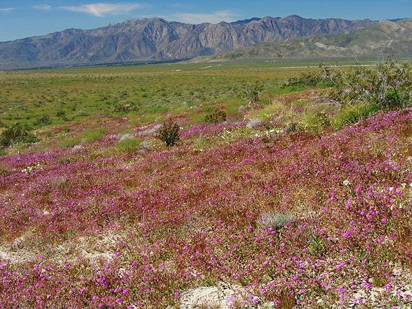 Sand verbena in Borrego Badlands, Borrego Valley and San Ysidro Mtns in back