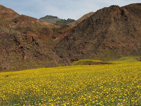 Desert gold sunflowers cover a fan at the base of the Black Mtns, west of Jubilee Pass