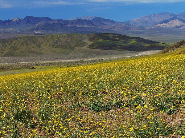 Desert gold sunflowers sweep down the fan to Death Valley with Confidence Hills in back