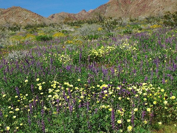 Desert dandelion, lupine, and brittlebush paint the bajada toward Cottonwood Mtns, Joshua Tree NP