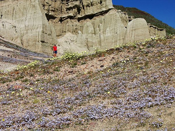 Karen admires the blue phlox on saddle at head of Hagan Cyn
