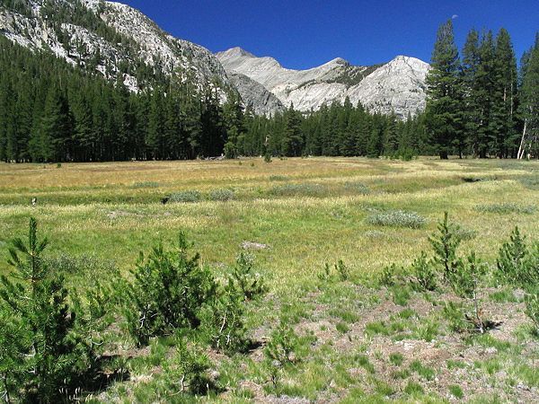 Evolution Meadow, looking west to peaks on the far side of Goddard Canyon. This is the lowest of the three great meadows in Evolution Valley.