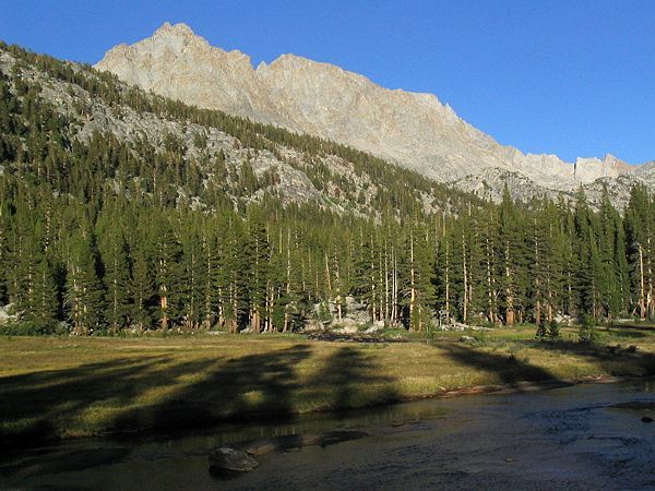 The lowering sun casts long tree shadows across Colby Meadow towards Mts. Mendel (left) and Darwin (center).