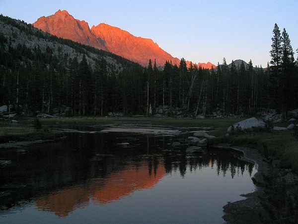 The final deep red tints of alpenglow on Mts. Mendel and Darwin above the deepening shadows of Colby Meadow.