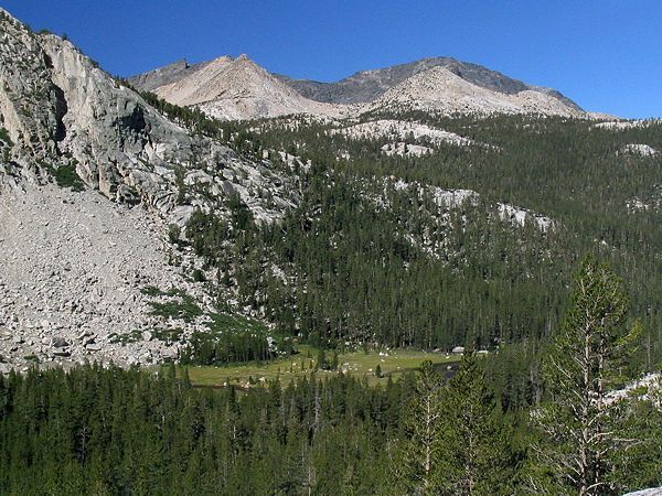 The John Muir Trail switchbacks up the headwall of Evolution Valley. View west across to Emerald Peak.