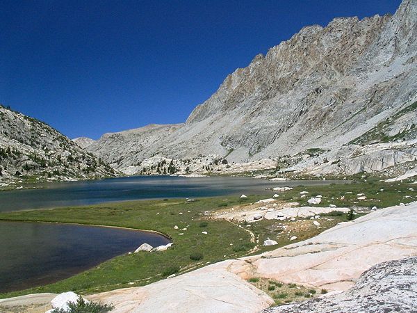 The cliffs of Mt. Mendel rise above Evolution Lake, looking north from near the inlet.