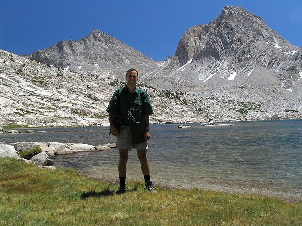 Phil at Sapphire Lake, with Mts. Fiske (left) and Huxley (right) beyond.