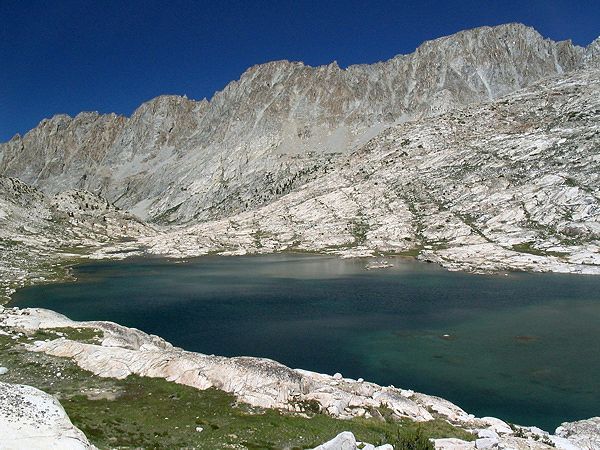 View north down the length of Sapphire Lake to the cliffs culminating in Mts Mendel (middle) and Darwin (right).