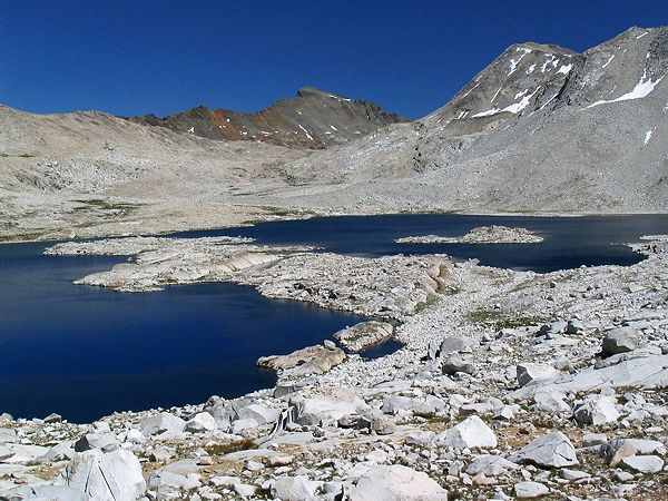 From the low divide between Wanda Lake and Davis Lake, we see a peninsula that nearly cuts Wanda Lake in two, with the Black Giant rising beyond Muir Pass.