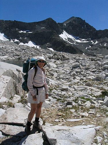 Karen at the high point of the trip (11,700 feet) on the cross-country divide between Wanda Lake and Davis Lake. Dark Mt. Goddard rises to the southwest.