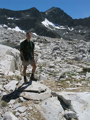 Phil at the high point on the divide between Wanda and Davis Lakes. The route leads through the jumbled, but stable talus field.