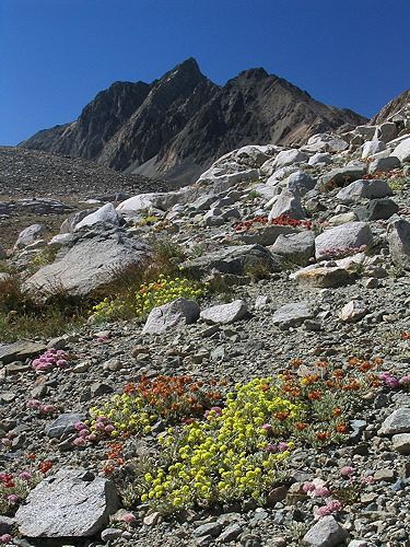Numerous flowers carpet the slopes at the head of the valley above Davis Lake, including yellow Sulphur Flower, pink Pussypaws, and red Alpine Buckwheat. Mt. McGee in the background.