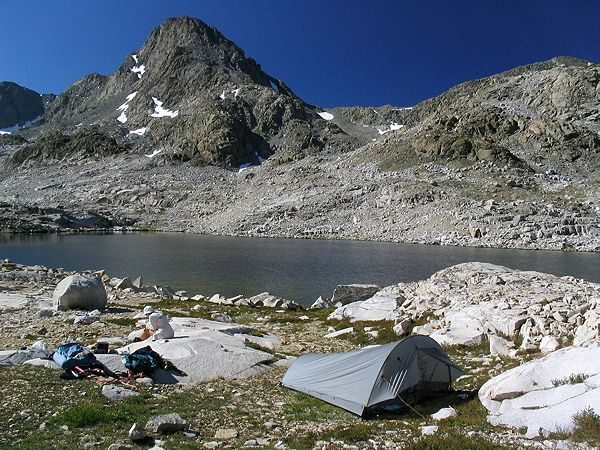 Morning light shows our fourth night campsite on the pristine and deserted north shore of Davis Lake.