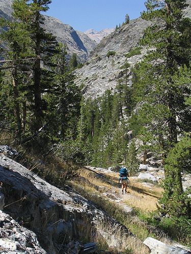 When we reach the bottom of Goddard Canyon, we ford the South Fork San Joaquin River and pick up the trail heading downstream (north).