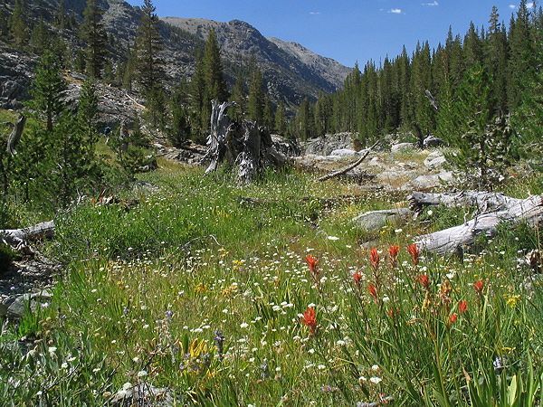 Paintbrush and other flowers along the trail, looking north down Goddard Canyon.