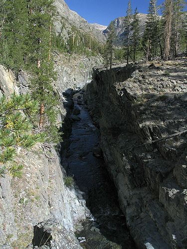 For five miles down Goddard Canyon from North Goddard Creek, the South Fork San Joaquin River is encased in a deep narrow gorge. We camp alone for the fifth night at one of only three locations where the river - and its water - can be accessed.