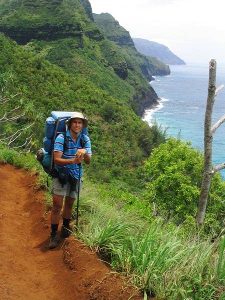 After the rocks, comes the mud. Most of the trail is this heavy red clay which is very muddy and slippery when wet. Phil poses by the first good view to the southwest, with the destination in the far distance.