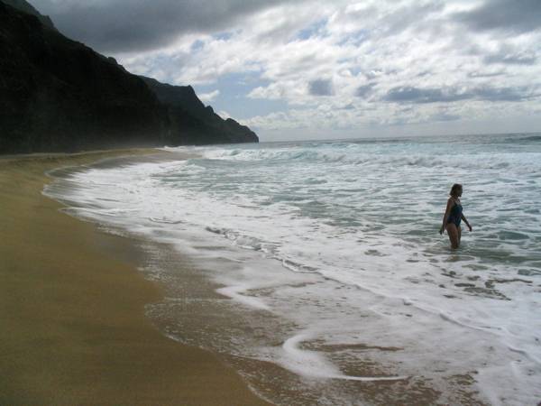 At last, Kalalau Beach! Camping is good, but the surf is too rough for swimming. Even knee keep, like Karen here, you get pushed around a lot.
